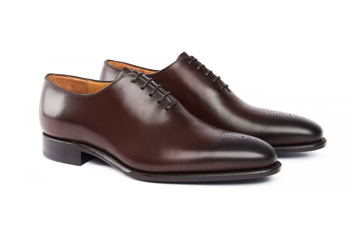 Emling's dark brown leather wholecut Dylan makes a statement about the Oxford being the raciest looking shoe. Goodyear welted, it offers total comfort and durability. The fine perforations of the medallion highlight the exquisite craftsmanship of Emling's master shoemakers.