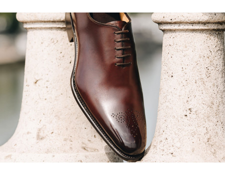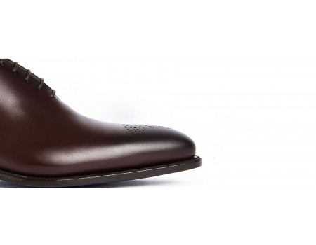 Le modèle Dylan en cuir marron foncé confirme que le Richelieu one-cut est la chaussure à l’allure la plus racée. Son empeigne lisse délicatement perforée offre un confort total avec son montage Goodyear. La finesse des perforations du bout fleuri met en lumière le travail artisanal des maîtres chausseurs Emling.